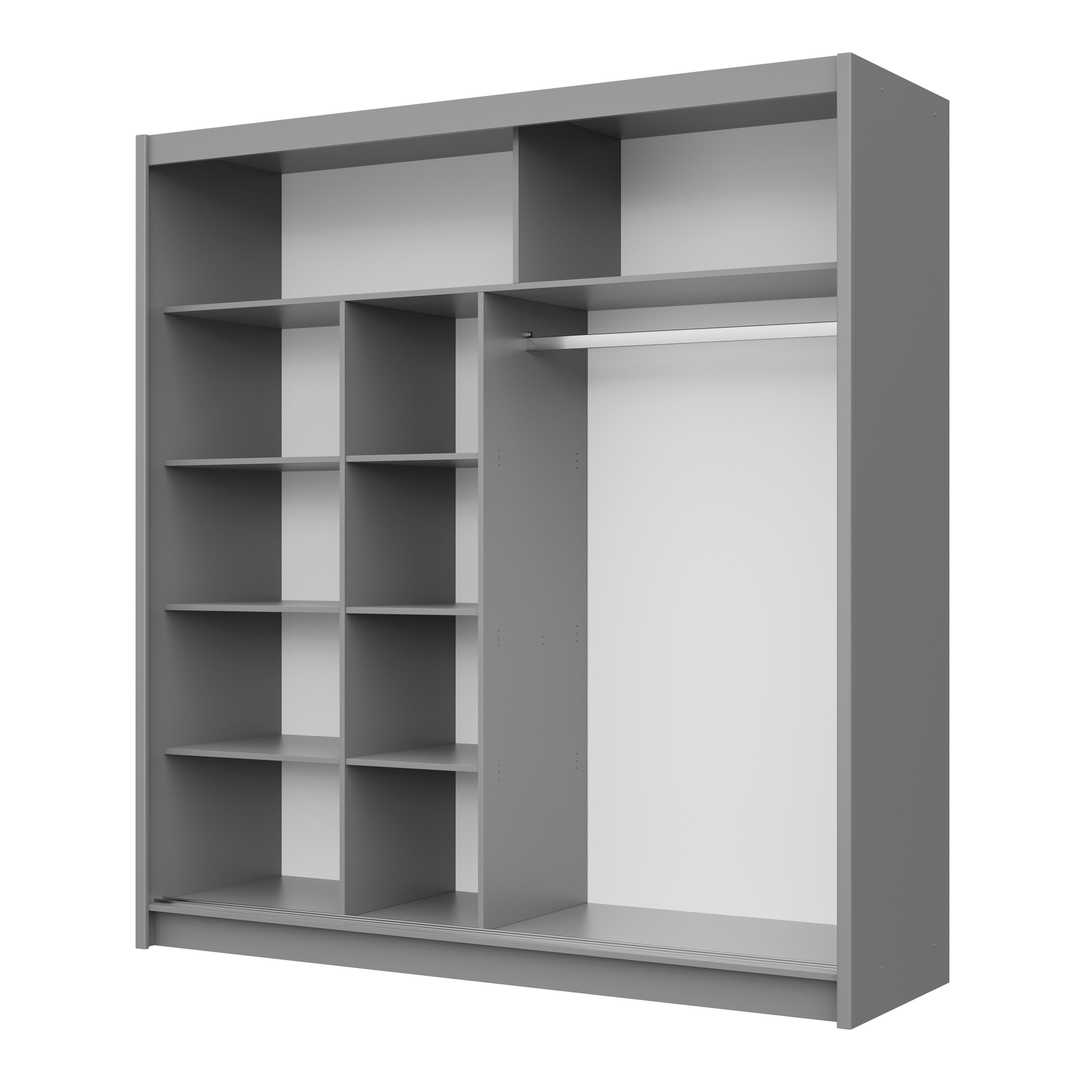 Maximize the wardrobe's storage capacity by incorporating one hanging rail, six column shelves, and two top shelves.