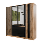 The HAMPTON LUX D4 Wardrobe in Oak Wotan and Black with a stylish lamella finish combines modern design with ample storage. It features four hinged doors, including two mirrored doors for added depth and functionality. Inside, the wardrobe offers eight spacious shelves and a hanging rail, ideal for organizing clothes and accessories. Three exterior drawers provide easy access to essentials, making this wardrobe both a practical and elegant addition to any bedroom.