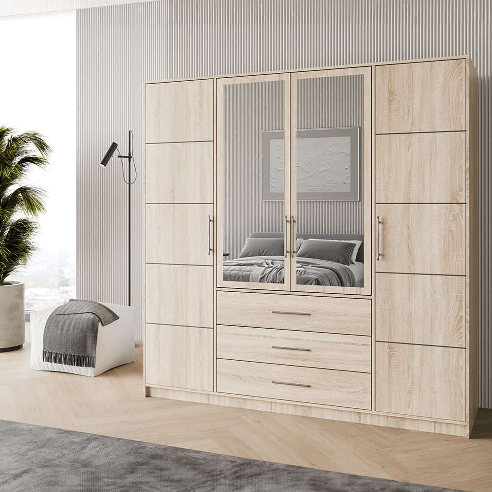 The HAMPTON D4 wardrobe in oak sonoma exudes warmth and charm, making it an ideal addition to any bedroom. It features four hinged doors, with mirrors on the two middle doors for added convenience and style. Inside, the wardrobe is equipped with one hanging rail and eight shelves, providing ample storage space for clothing and accessories. Three external drawers offer easy access to smaller items, helping you keep your space organized. With its inviting oak sonoma finish and functional design, the HAMPTON D4 wardrobe beautifully combines elegance with practicality.